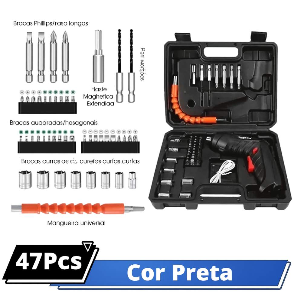 47 acessórios variados (brocas, bits, adaptadores e extensão flexível)