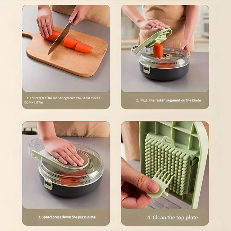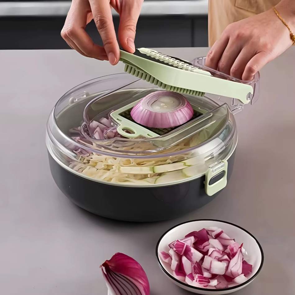 ✅ 9 funções em um só produto – fatiar, cortar, ralar, escorrer e armazenar com praticidade.