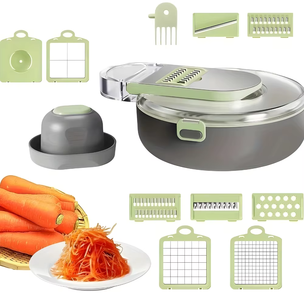 Chega de perder tempo no preparo dos alimentos! O Ralador Fatiador Cortador 9 em 1 é o utensílio multifuncional que vai revolucionar sua cozinha. Compacto, prático e eficiente, ele proporciona cortes uniformes, fáceis e organizados, tornando cada refeição mais rápida e prazerosa de preparar.
